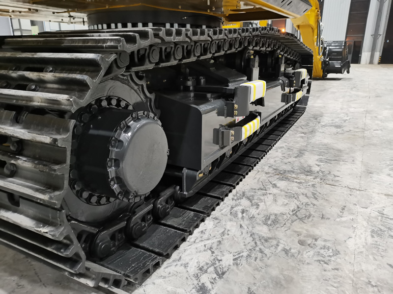 Khung gầm được gia cố thêm bằng số lượng bánh xe đỡ (2 x 9) và tấm xích (2 x 50) tăng lên, giúp phân bổ trọng lượng đáng kể của máy đồng đều hơn. Thiết kế này giảm tải trọng tập trung và ứng suất trên các bộ phận riêng lẻ, kéo dài đáng kể tuổi thọ của con lăn, bánh dẫn hướng và mắt xích, đặc biệt trong các ứng dụng chịu va đập mạnh hoặc mài mòn như khai thác mỏ và đào đá.