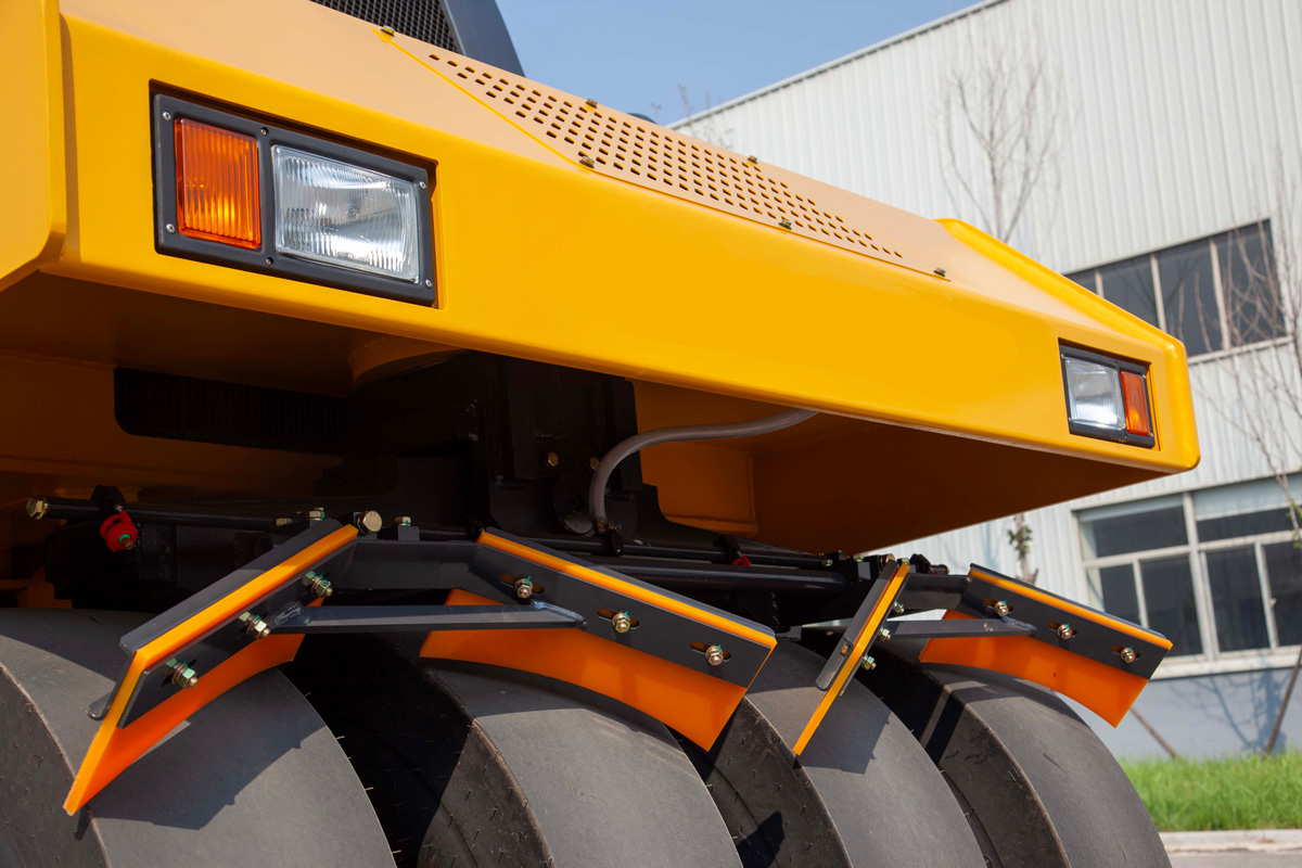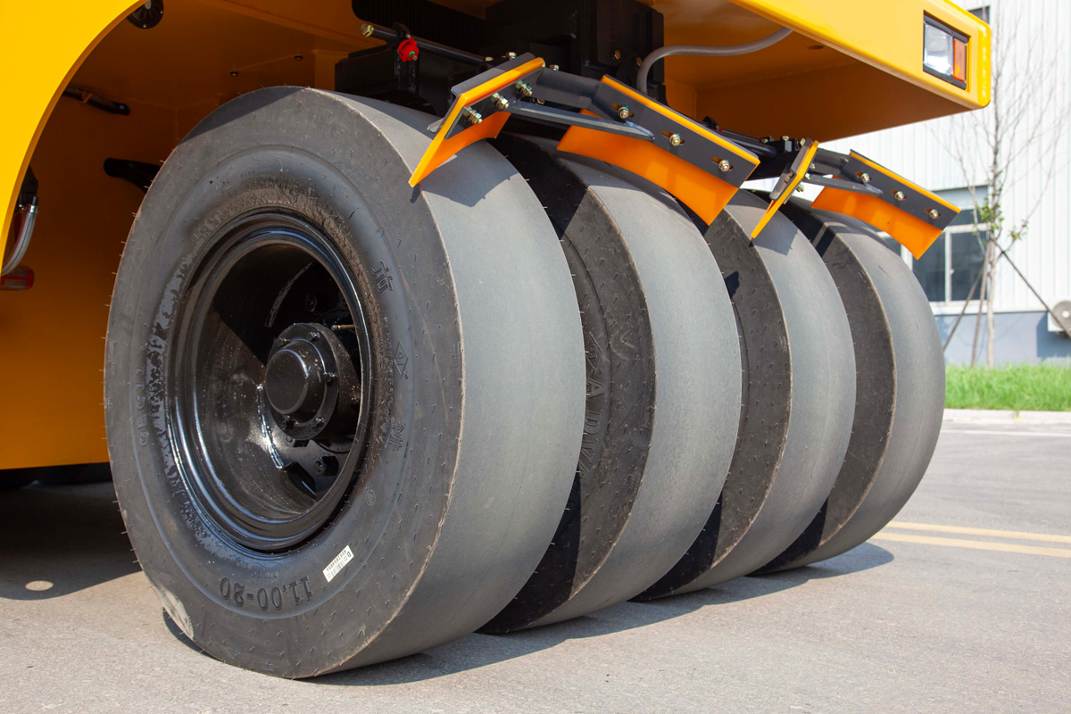 Hệ thống đặc biệt gồm 4 bánh xe khí nén phía trước và 5 bánh xe khí nén phía sau đảm bảo bao phủ toàn bộ đường đầm. Thiết kế này tạo ra hiệu ứng nhào trộn đặc trưng, giúp bịt kín bề mặt, tăng mật độ và ngăn ngừa nứt hoặc xê dịch vật liệu.